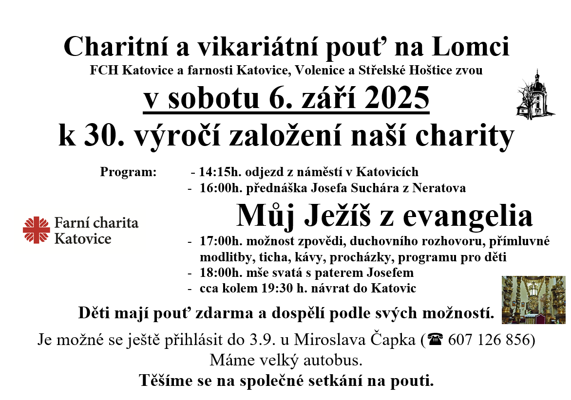 Přijměte pozvání na charitní a vikariátní pouť na Lomec u Vodňan. Jedeme 6.9. odpoledne. Bližší informace o programu na plakátku. Těšíme se na společné setkání.