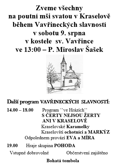 Přijměte pozvání na pouť sv. Vavřince a Vavřinecké slavnosti v sobotu 9. srpna od 13 hodin. Bližší informace na plakátku v příloze.