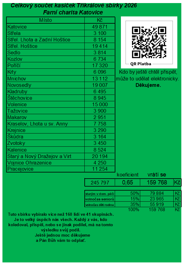 Přinesli jsme Boží požehnání skoro do všech míst našich farností. Lidé byli velmi štědří a celkem dali do pokladniček 245 797 Kč. Moc děkujeme za štědrost i přijetí koledníků. Finance budou využity pro nemocné v domácí péči a na mnoho volnočasových aktivit pro seniory i celou rodinu. Bližší informace o tom kolik se kde vykoledvalo v TS je v příloze. Ještě jednou všem koledníkům, vedoucím, dobrodincům a dárcům patří velký dík a Boží požehnání.